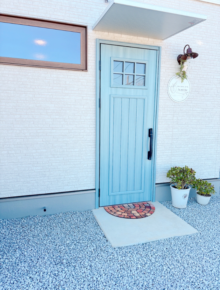ローソン川島東町店さまの交差点から、ひとつ南に入った交差点の角地にある戸建ての建物です。水色のドアと、庭の植物たちが目印です。お車でお越しのお客さまは、店舗敷地内の砂利スペースにお停めください ☆*
